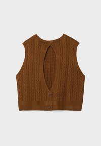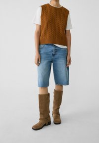 Personne portant un gilet sans manches en tricot torsadé marron par-dessus un t-shirt blanc, associé à un jean en denim bleu clair, mains dans les poches.