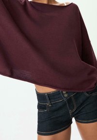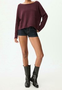 Femme portant un haut ample à manches longues bordeaux, un short en jean foncé, et des bottes en cuir noires mi-mollet, debout avec une main sur la hanche.