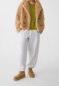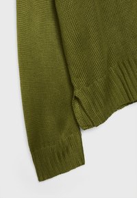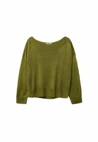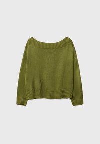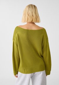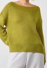 Femme portant un pull en maille olive vert ample à épaules dénudées et un pantalon de survêtement gris clair sur un fond uni.