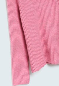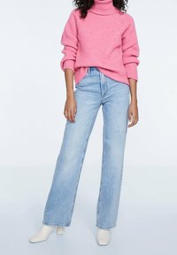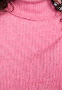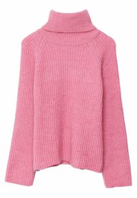 Pull à col roulé rose côtelé en matière douce, avec manches longues et coupe décontractée, associé à un jean bleu clair.