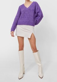 Personne portant un pull violet en maille torsadée à col en V et une jupe blanche avec une fente à l'avant, debout devant un fond clair uni.