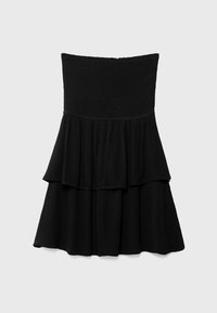 Combinaison noire sans bretelles avec un corsage smocké, une taille en peplum à couches et des shorts amples. Fabriquée en tissu léger, avec une surface texturée.