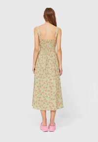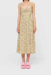 Robe midi florale en vert clair avec des motifs de roses roses, dotée d'un décolleté carré, de bretelles épaisses et d'une fente latérale pour plus de mouvement.