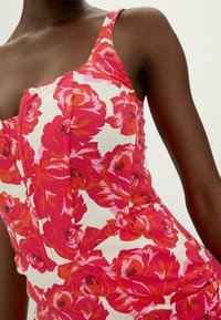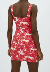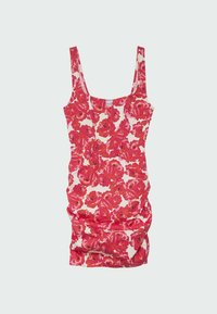 Robe mini sans manches ajustée avec un motif floral rouge et rose sur fond blanc, portée par une personne debout.