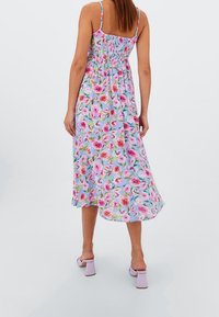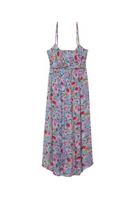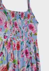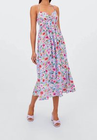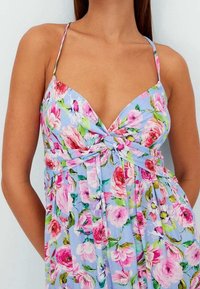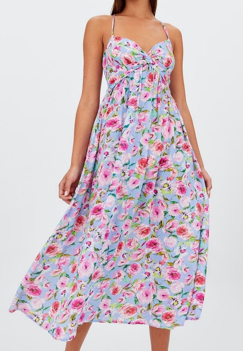 Robe midi sans manches avec un imprimé floral de roses roses et de feuilles vertes sur fond bleu clair, présentant un détail de nœud torsadé au niveau de la poitrine.