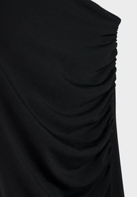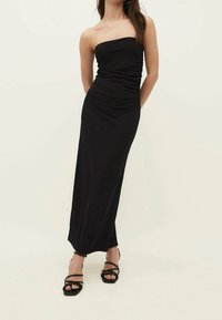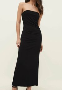 Robe maxi noire sans manches avec un corsage ajusté, texture froncée à la taille et tissu lisse jusqu'à la longueur des chevilles.