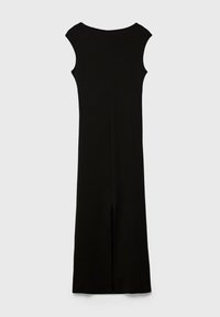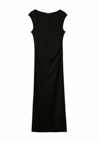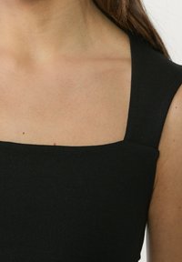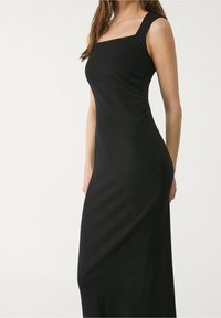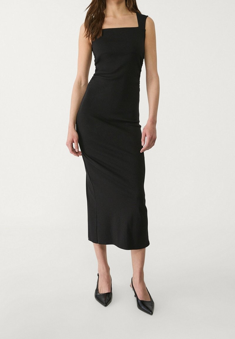 Robe midi noire ajustée avec un décolleté carré et de larges bretelles. Tissu lisse avec une légère élasticité et une jupe légèrement évasée.