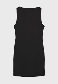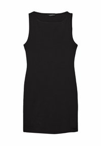 Robe bodycon sans manches noire en matériau extensible, avec un col montant et une silhouette ajustée, texture lisse sans motifs.
