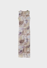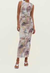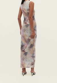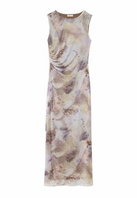 Robe maxi en tissu léger, présentant un motif abstrait multicolore dans des tons pastel, coupe ajustée et sans manches.