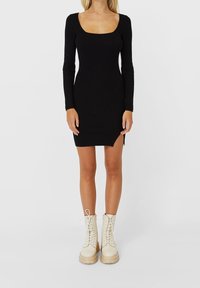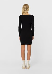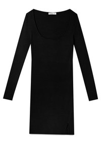 Robe noire côtelée avec des manches longues et un décolleté carré. Dotée d'une fente latérale pour la mobilité et d'une silhouette ajustée.