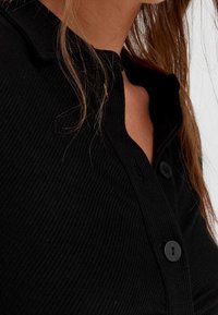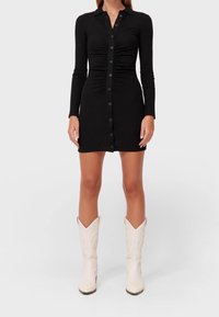 Robe noire côtelée à boutons avec manches longues, présentant un froncé vertical et des boutons noirs sur le devant, longueur au genou.