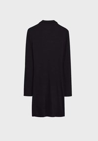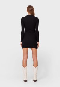 Femme portant une robe noire cintrée à manches longues avec des boutons et des détails froncés, debout devant un fond blanc uni.