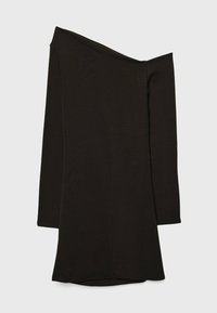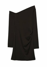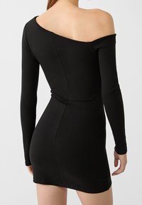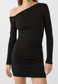 Femme portant une mini-robe noire ajustée à manches longues et un décolleté asymétrique une épaule nue, sur un fond uni.