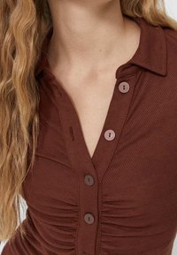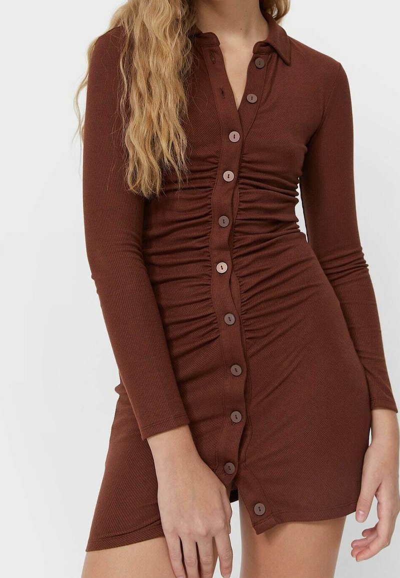 Femme portant une robe marron cintrée à manches longues avec des boutons sur le devant et des détails froncés, les cheveux blonds ondulés tombant sur une épaule.