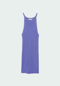 Femme portant une mini-robe violette sans manches, côtelée et ajustée, sur un fond gris clair uni.