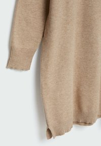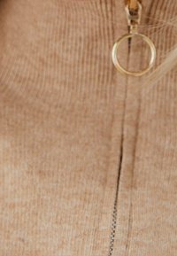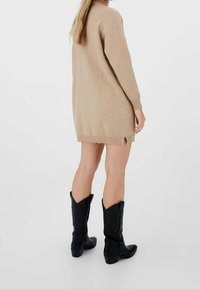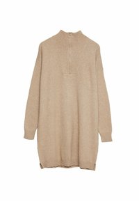 Robe en tricot beige dotée d'un col montant avec une courte fermeture éclair, de manches longues et d'un ourlet et de poignets côtelés. Texture douce, coupe décontractée.