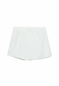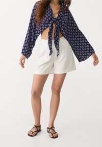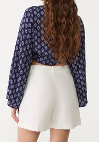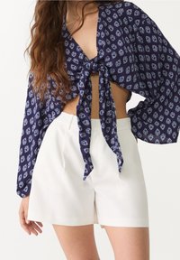 Femme portant un crop top à manches longues bleu marine à motifs, noué à l'avant, et un short blanc taille haute avec poches.
