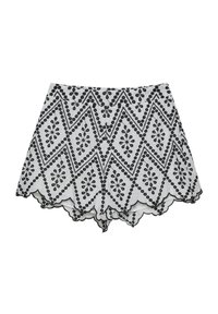 Femme portant un haut noir sans manches, un short blanc avec une broderie florale géométrique noire, un collier de fleurs en or, des bracelets en or au bras et au poignet.