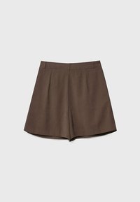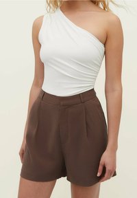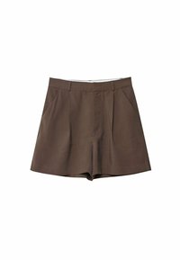 Shorts marron taille haute avec plis sur le devant, fabriqués dans un tissu lisse. Dotés de poches latérales et d'une apparence structurée et cintrée.