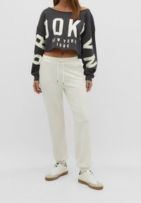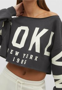 Sweat-shirt gris court à large encolure, avec les textes blancs "BROOKLYN", "NEW YORK" et l'année "1986". Manches longues et matériau doux.