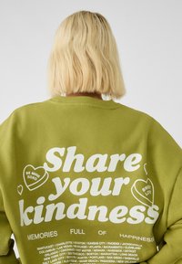 Personne avec des cheveux blonds portant un sweat-shirt vert surdimensionné avec le texte blanc "Partagez votre gentillesse" et de petits cœurs dans le dos.