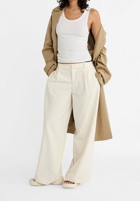Personne portant un trench-coat beige à double boutonnage, un débardeur blanc et un pantalon large crème, les mains dans les poches du manteau.