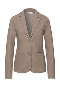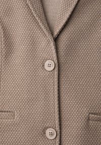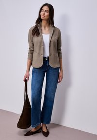Blazer léger beige avec deux poches avant, revers crantés et fermeture par bouton, associé à un haut blanc et un jean bleu.