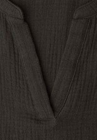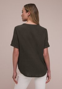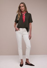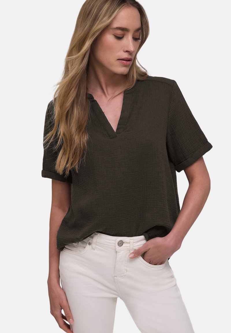 Femme portant un chemisier à manches courtes vert foncé en V et un pantalon blanc, la main gauche dans la poche, regardant vers le bas à sa gauche.