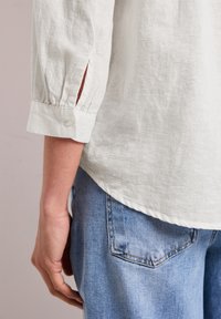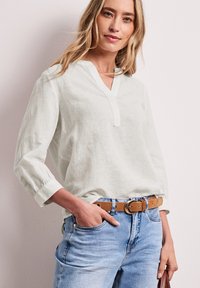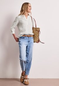Femme blonde portant un chemisier blanc à manches longues avec un col en V et un jean bleu clair, accessoirisée d'une ceinture marron et de boucles d'oreilles créoles en or.