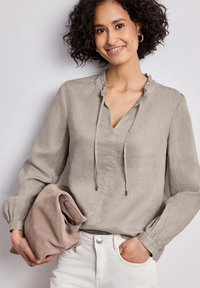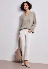 Femme aux cheveux bouclés portant un chemisier ample taupe à manches longues et un pantalon blanc, regardant sur le côté, tenant une pochette.