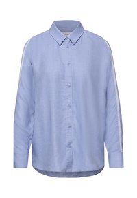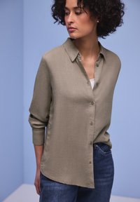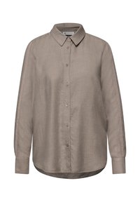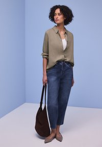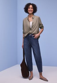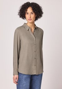 Femme aux cheveux bouclés portant un chemisier taupe à manches longues et boutonné, ainsi qu'un jean bleu, debout devant un fond uni.