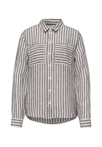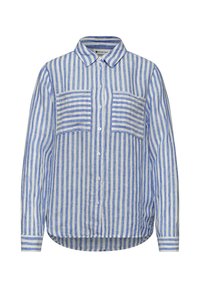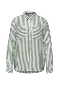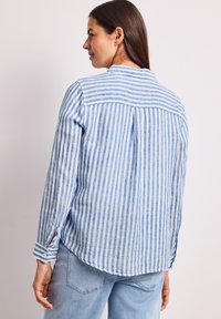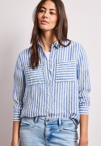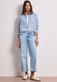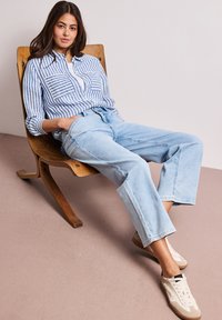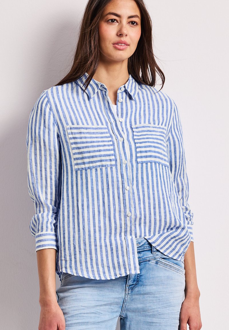 Femme portant une chemise à boutons à rayures verticales bleues et blanches avec deux poches poitrine à rayures horizontales, associée à un jean bleu clair.