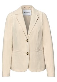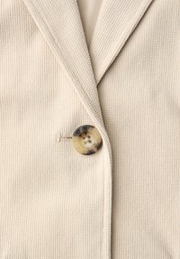 Femme aux cheveux bouclés portant un blazer crème et un jean bleu, tenant un sac à main tissé marron foncé sur un fond gris clair.