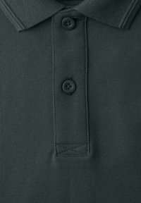 Homme portant un polo vert foncé et un pantalon beige, debout contre un mur gris uni, les mains dans les poches.