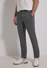 Chinos en coton mélangé gris à coupe slim, avec des poches avant, une taille avec passants de ceinture et des détails de boutons contrastants.