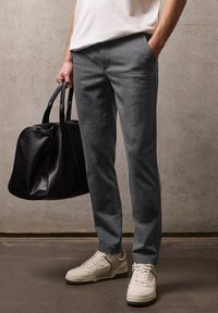 Chinos gris foncé en twill de coton, avec une coupe droite, des poches avant et un léger brillant, associés à des baskets de couleur claire.