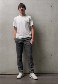 Homme portant un pantalon gris foncé ajusté, des baskets blanches et un t-shirt blanc, debout avec une main dans la poche, devant un fond uni.