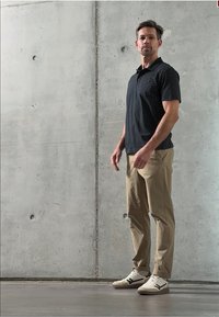 Homme portant un polo noir à motifs et un pantalon kaki, les mains dans les poches, debout devant un fond clair uni.