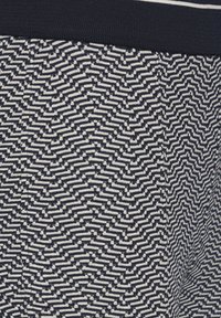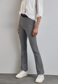 Personne portant un pantalon en maille à motifs noir et blanc, une chemise blanche retroussée et des baskets blanches, debout sur un sol gris.