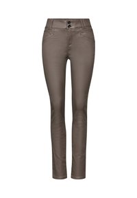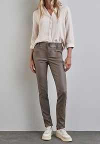Pantalons slim-fit taupe avec une texture lisse, deux poches avant et deux boutons noirs à la taille, associés à des baskets blanches.
