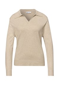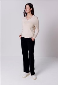 Femme aux longs cheveux bruns portant un pull beige col en V sans col et un pantalon noir, debout avec une main dans la poche contre un fond uni.