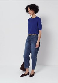 Femme aux cheveux bouclés, portant un pull bleu à manches courtes et un jean en denim, debout devant un fond gris clair uni.
