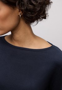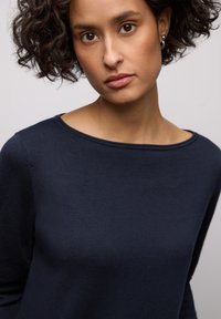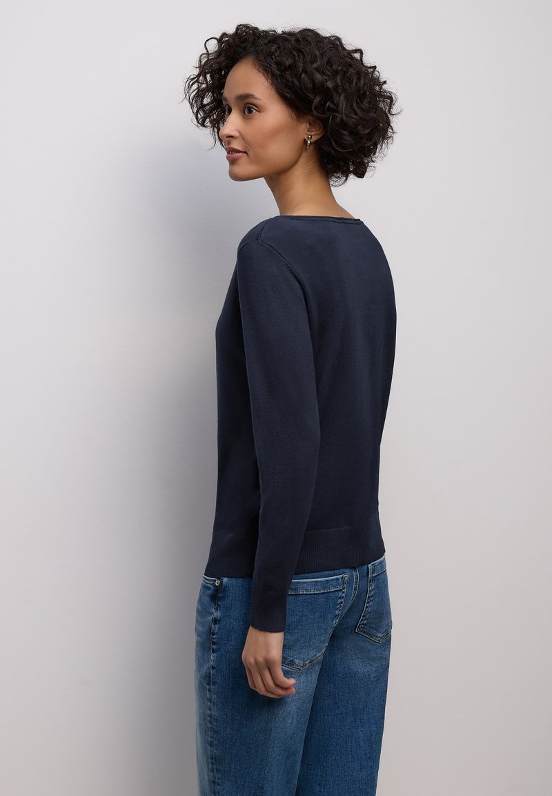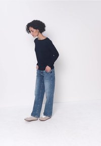 Pull à manches longues bleu marine avec un col rond, des poignets et un ourlet côtelés. Associé à un jean bleu clair à jambes larges, offrant une coupe décontractée.