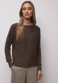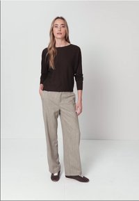 Femme aux cheveux blonds longs portant un pull marron à manches longues et un pantalon gris clair texturé, debout devant un fond clair uni.