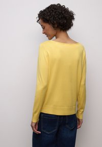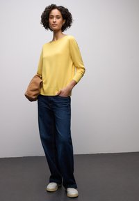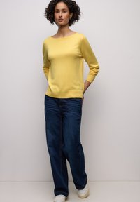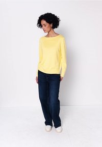 Pull jaune tricoté avec un large col et des manches longues, associé à un jean bleu foncé. Texture lisse, coupe décontractée.