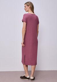 Cette robe en jersey unie apporte une touche moderne à votre style quotidien avec sa structure côtelée fine. Le mélange léger de viscose tombe magnifiquement doux et assure un grand confort. L'encolure ronde, les manches courtes et les fentes latérales soulignent le caractère décontracté et casual. Une robe polyvalente que vous pouvez porter sans effort en de nombreuses occasions.