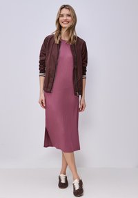 Une femme souriante porte une robe midi violette côtelée avec une fente latérale, une veste bomber marron et des baskets marron à lacets blancs, debout sur un fond uni.