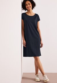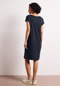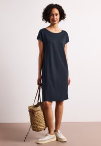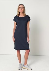 Femme aux cheveux bouclés foncés portant un haut bleu marine à manches courtes, face à l'objectif sur un fond clair uni.