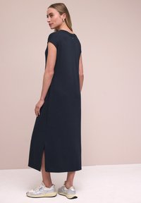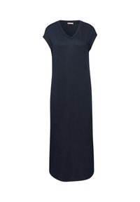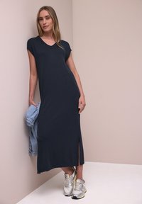 Femme en robe longue bleu marine col en V et baskets argentées tenant une veste en jean bleu clair pliée sur fond uni.