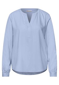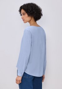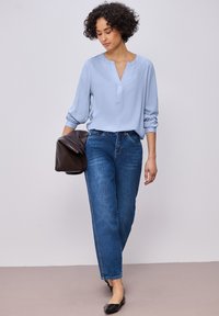 Femme aux cheveux bouclés portant un chemisier bleu clair et un jean, tenant un sac marron foncé, appuyée contre un mur blanc.